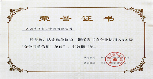 浙江省AAA级守合同重信用单位证书(2015年)