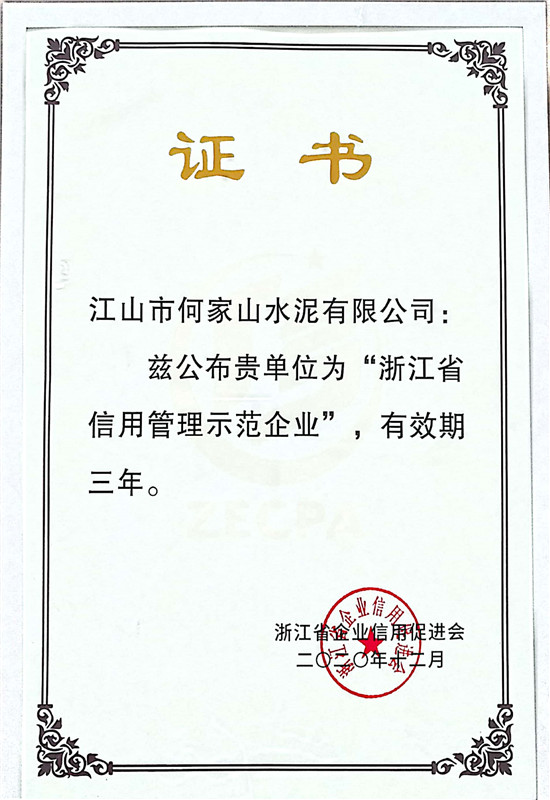 浙江省信用管理示范企业证书(2020年)